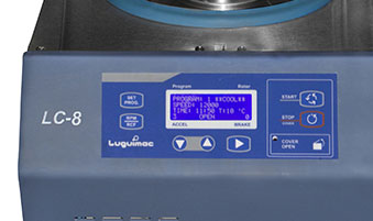 Pantalla de cristal líquido LCD de 4 líneas por 20 caracteres que indica: número de programa, RPM, fuerza G, tiempo de centrifugado, nivel de freno, estado de funcionamiento y alertas.
