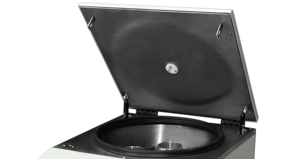 Recipiente y tapa del recinto de centrifugación en acero inoxidable. colocado dentro de cilindro de protección de chapa.Cuenta con Dos resortes neumáticos de tapa.